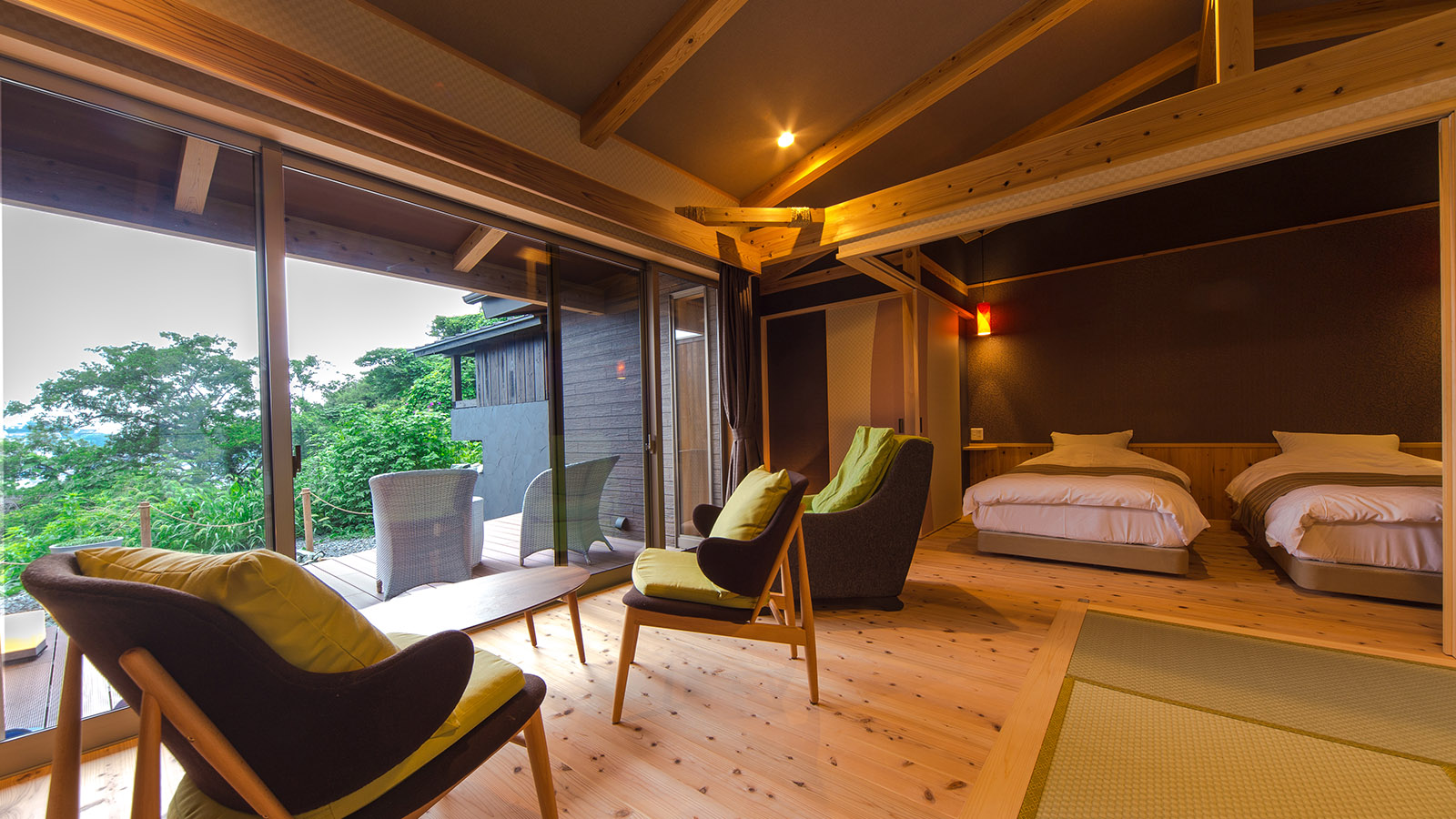 海側のお部屋からは夕日が美しい産湯ビーチの景色も楽しむことができ、耳を澄ませば、海の波の音が聞こえます♪