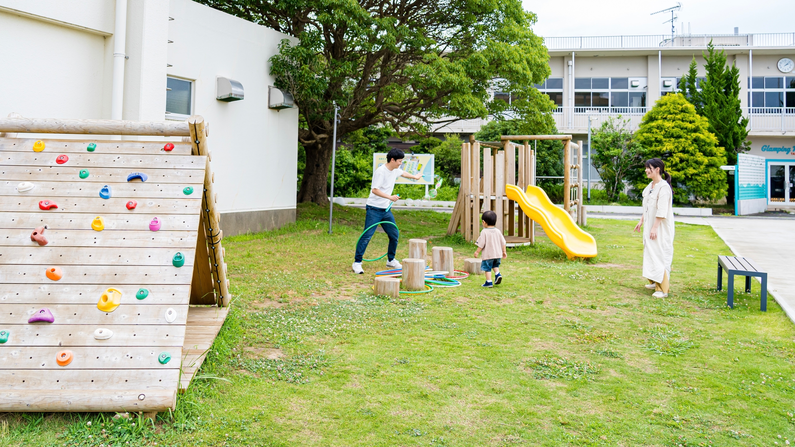 「高滝湖グランピングリゾート」は廃校となった小学校をリノベーションした、高滝湖が一望できるグランピング施設。