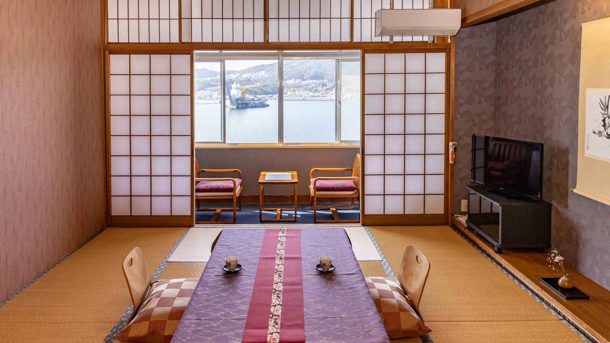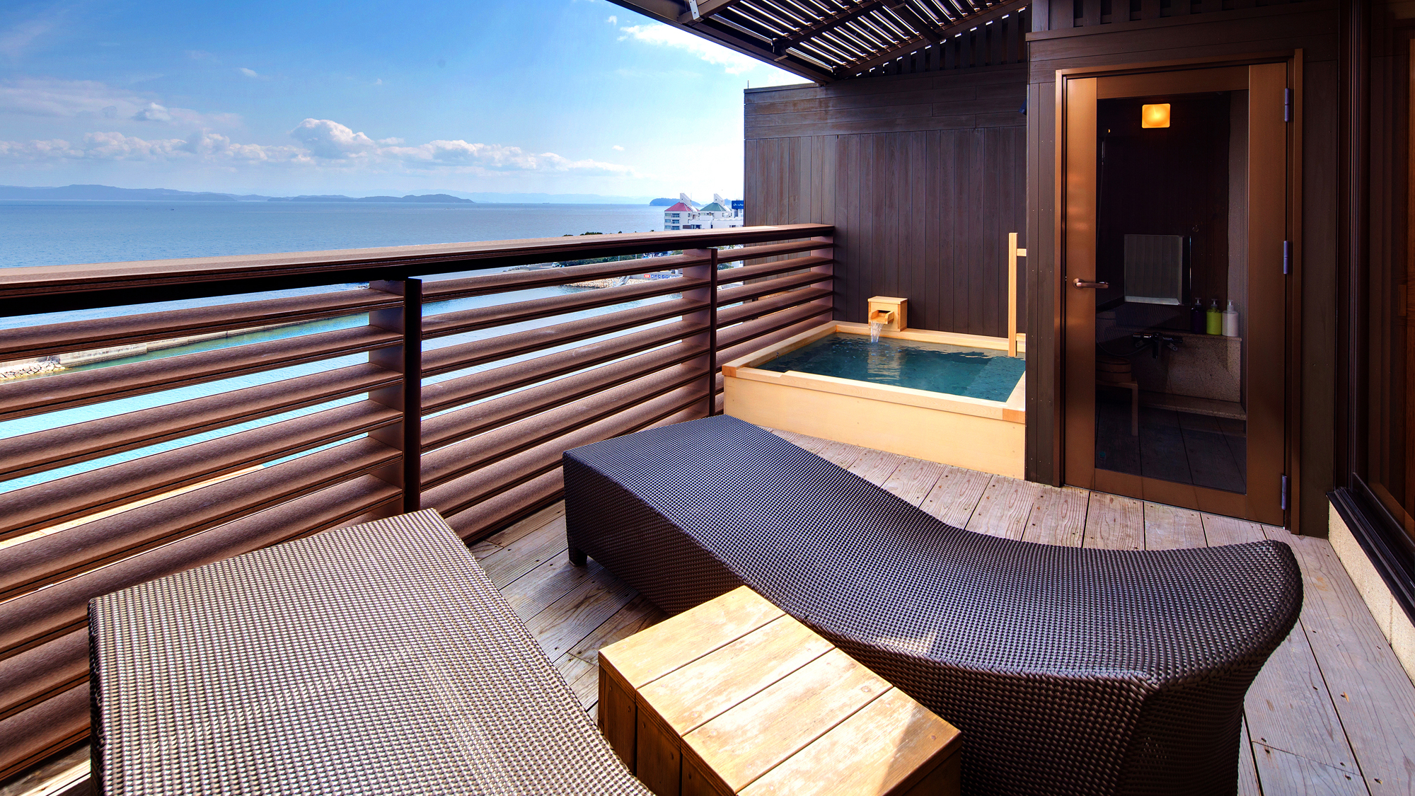 海の見える檜造りの展望風呂と陽光が差し込む大きな一枚ガラスの窓を備えたリビングダイニングが特徴的な75平米の特別客室です!