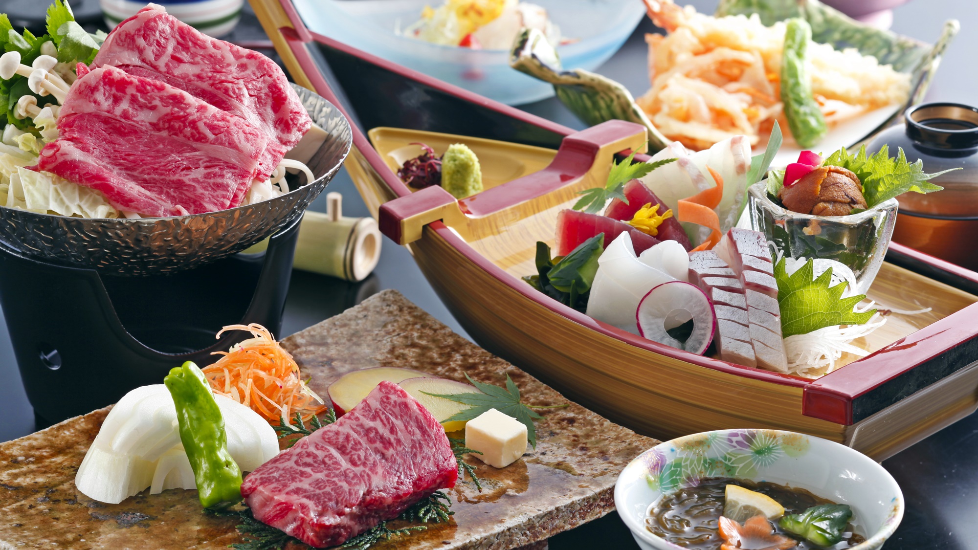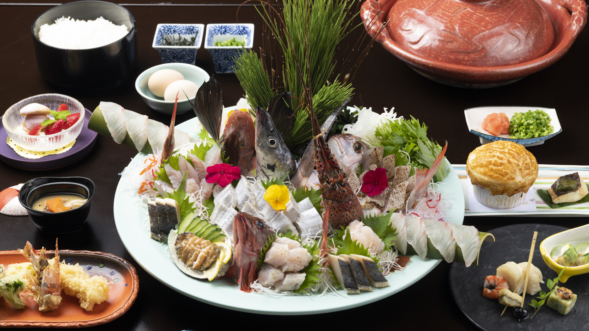 プランにより、「但馬牛」に冬期には「松葉ガニ」、宿のテラスにある「天然生け簀」から豪華地魚造り盛りなどなど、海と山に囲まれ贅沢三昧な夕食を堪能することができます♪