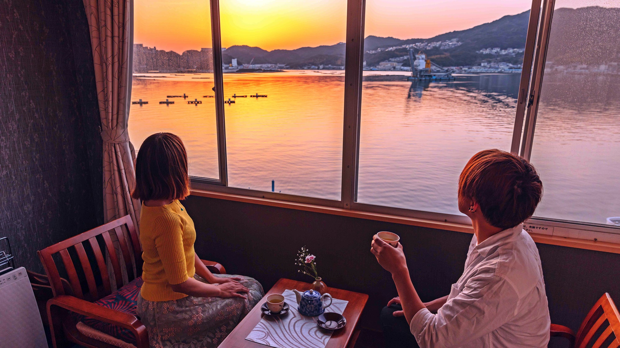客室の窓からは福良湾が広がり、 夕食はお部屋からオーシャンビューを独り占めできる至福のひととき!