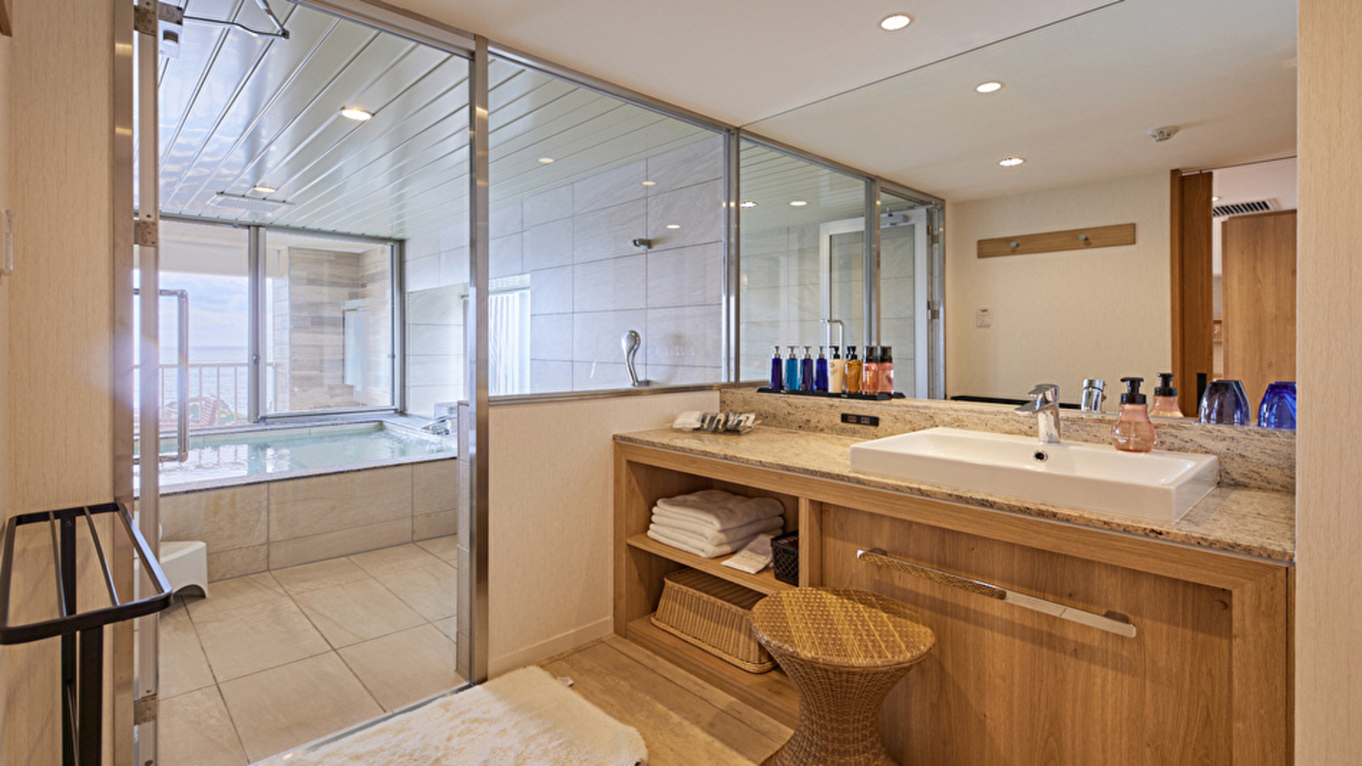 一般客室でのお風呂はジャグジー付大浴場、温泉 、海の見える半露天風呂を利用でき、半露天風呂は、貸切もOKです!