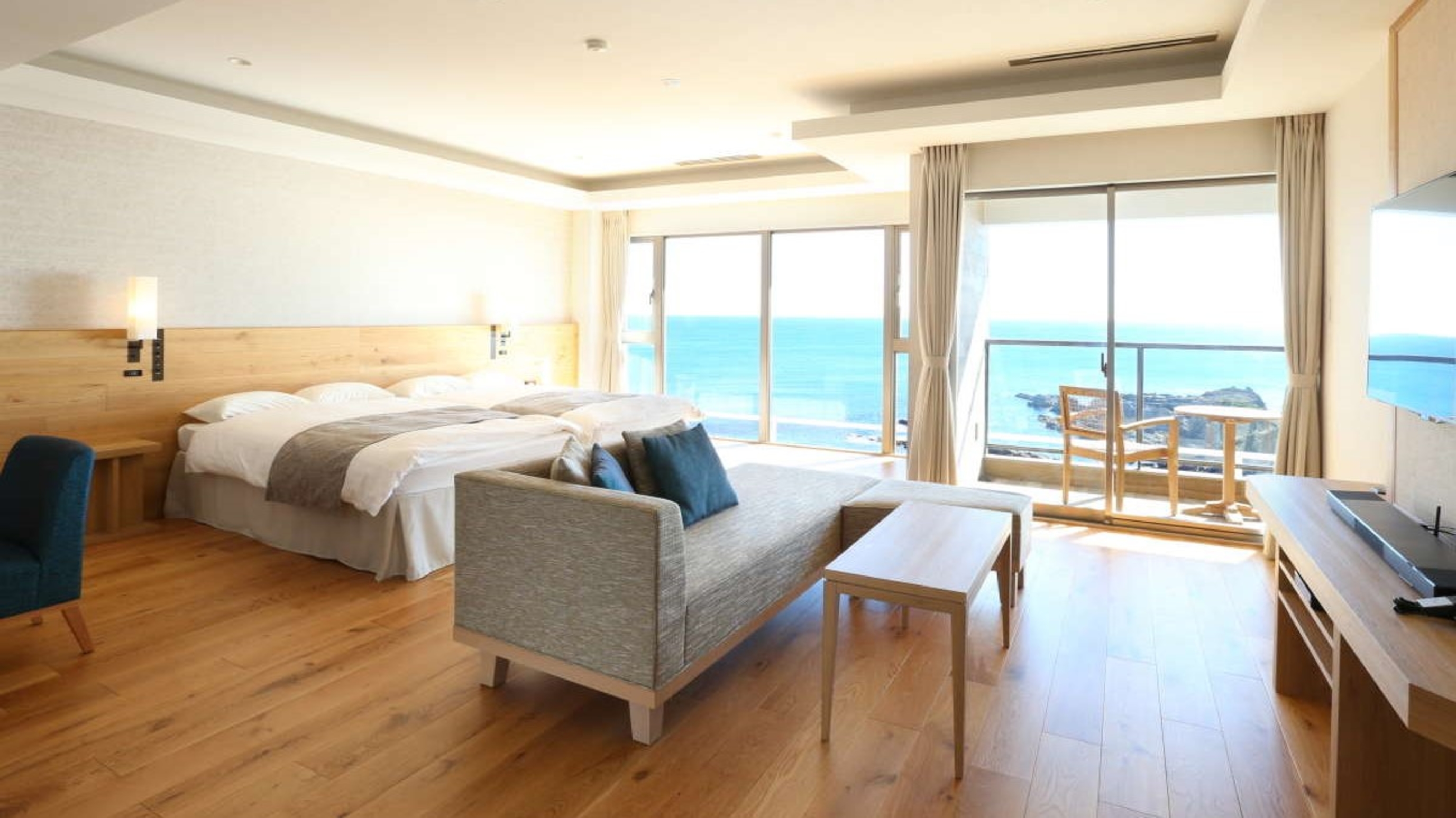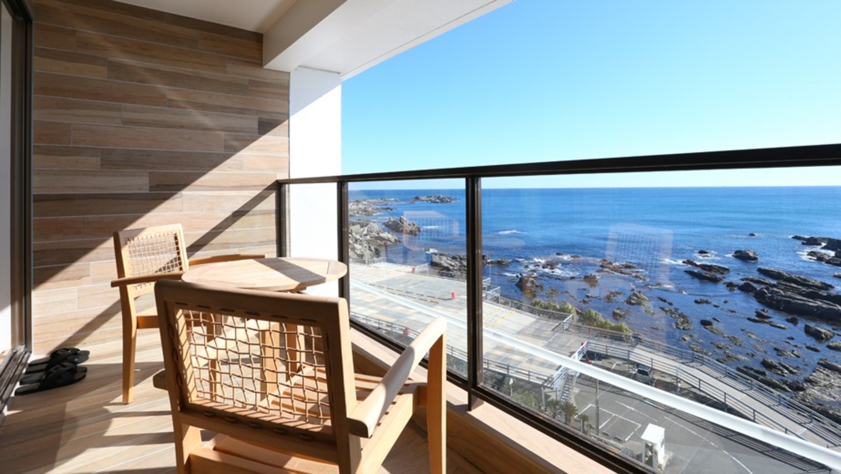 リゾート地ならではの南国気分を味わえるDXツインのお部屋に、バルコニー越しに海を臨める半露天風呂付プレミアムルームを備える「潮騒リゾート鴨川」