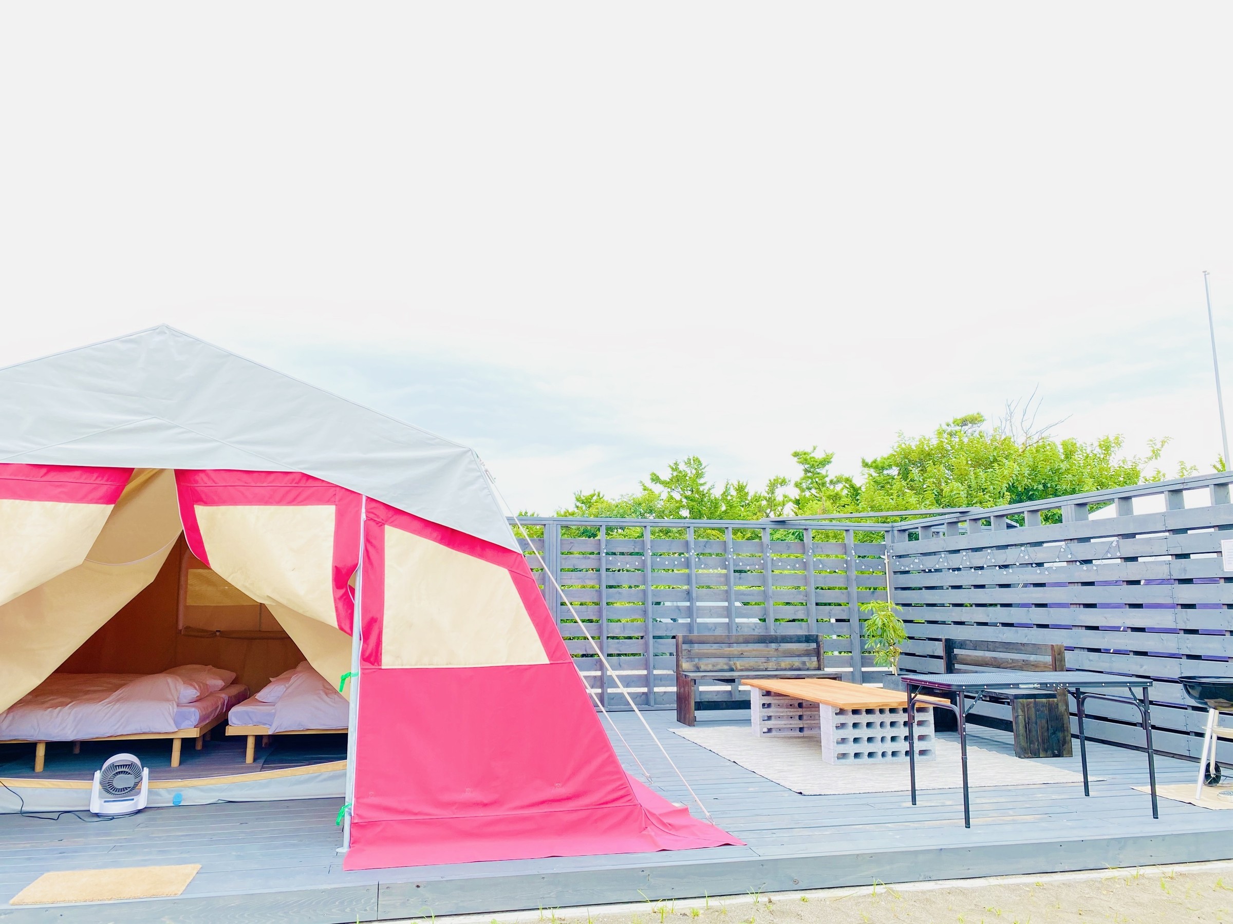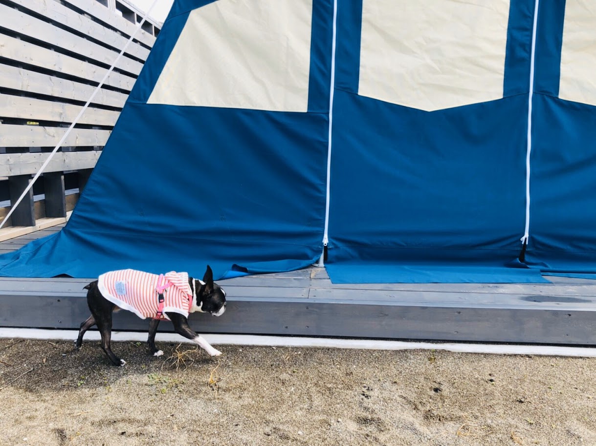 プライベートウッドデッキ付きのテントには4台のシングルベッドを設置しており、波の音を聞きながら愛犬と一緒にグランピングをお楽しみいただけます♪
