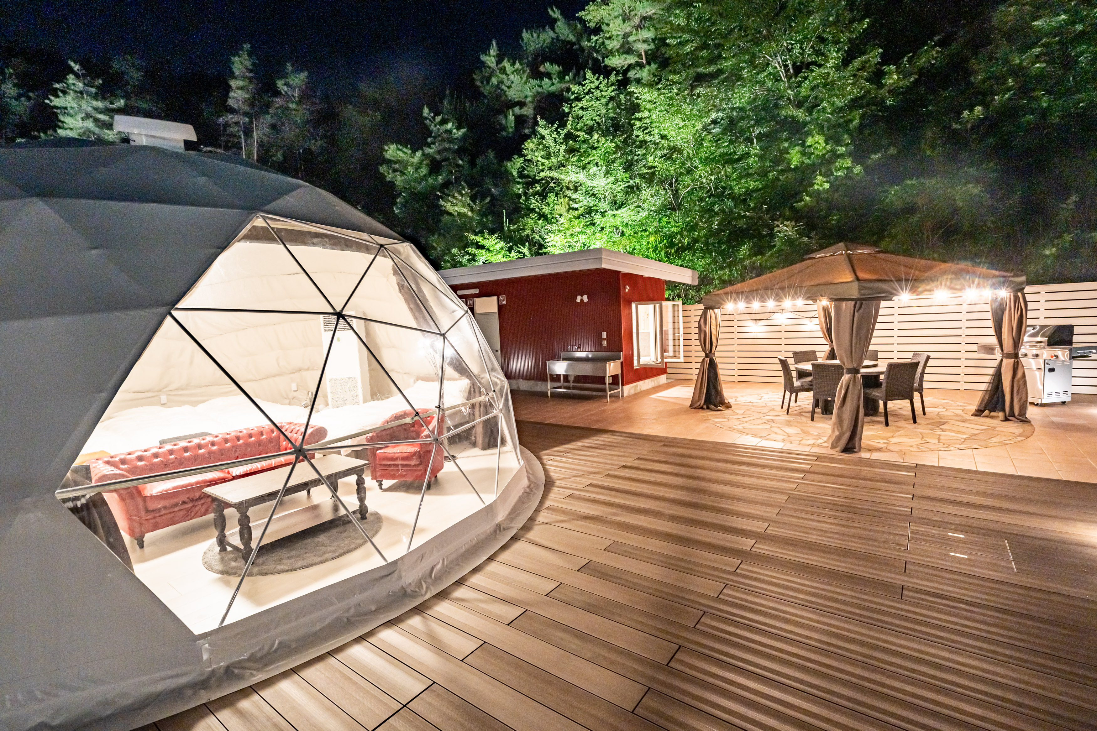 宿泊は⾼級ヴィラやドームテント、ウッドキャビン、ドームハウスにて、優雅な⾮⽇常の空間でグランピングを満喫することができるでしょう♪