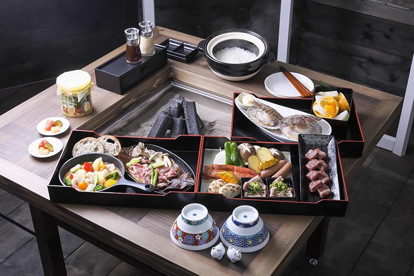 お食事は敷地内の専用ガゼボにて炭火を使った囲炉裏スタイルでグランピングディナーをお楽しみいただけます♪