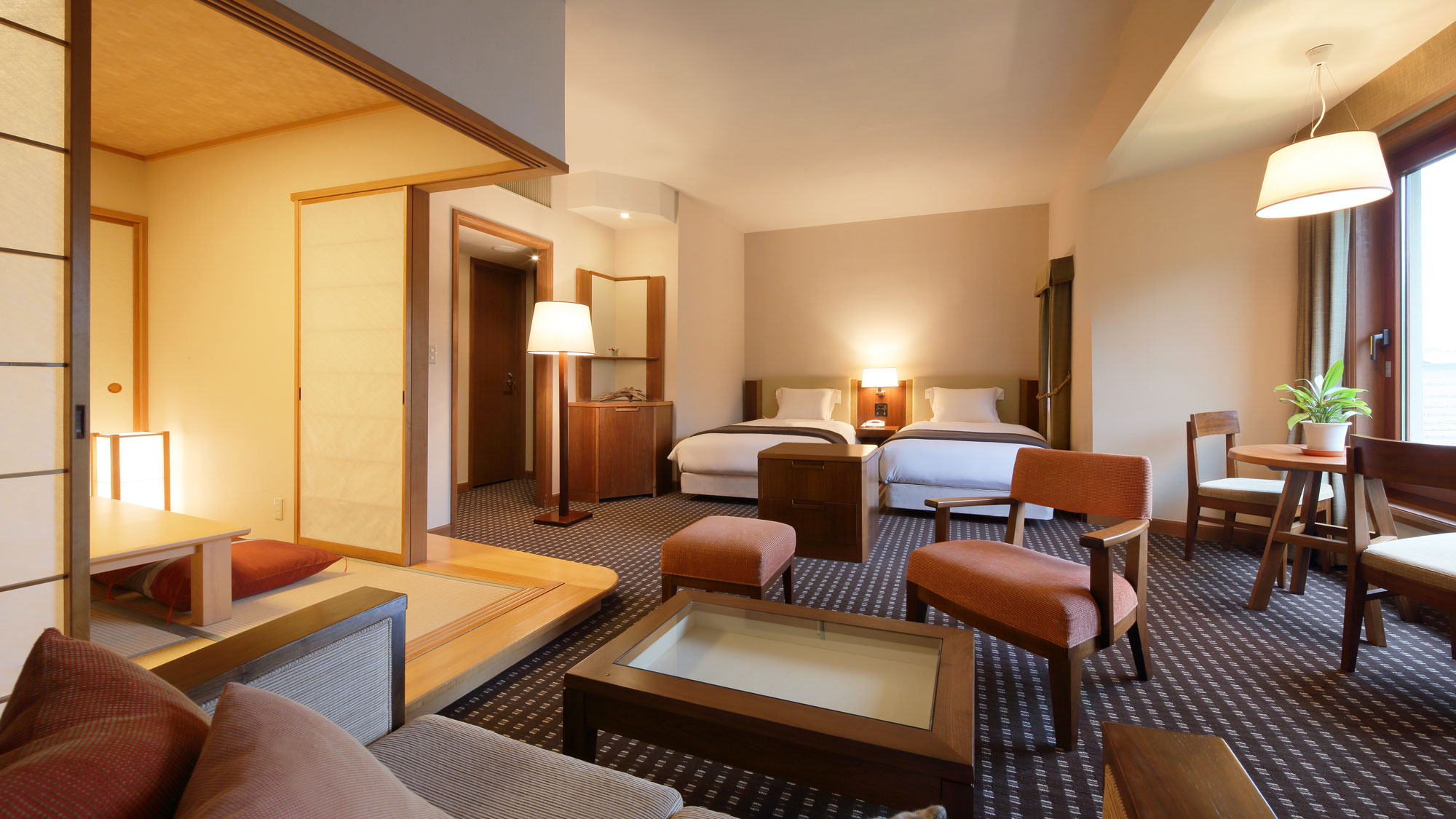 テレビ・衛星放送・電話・ファックス・インターネット接続(無線LAN形式)・湯沸かしポット・お茶セット・冷蔵庫・ドライヤー・ズボンプレッサー(貸出)・電気スタンド(貸出)・アイロン(貸出)・加湿器・個別空調・洗浄機付トイレ・ベビーベッド・石鹸(固形)・石鹸(液体)・ボディーソープ・シャンプー・コンディショナー・ハミガキセット・カミソリ・くし・ブラシ・タオル・バスタオル・くつろぎ着の作務衣・スリッパ・金庫