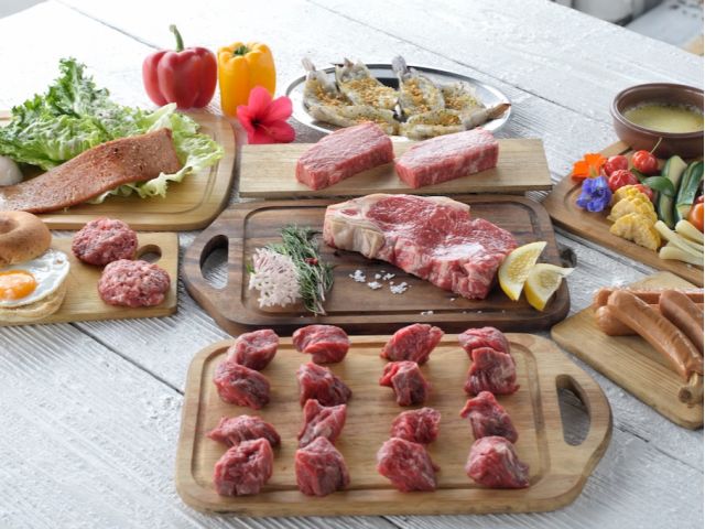 「オーシャンラウンジ」での手ぶらBBQプランでは地産のブランド和牛「もとぶ牛」と「アグー豚」をメインとした上質なお肉を使用し、野菜は近隣の農家が育てた地産の旬なものをご提供しています♪