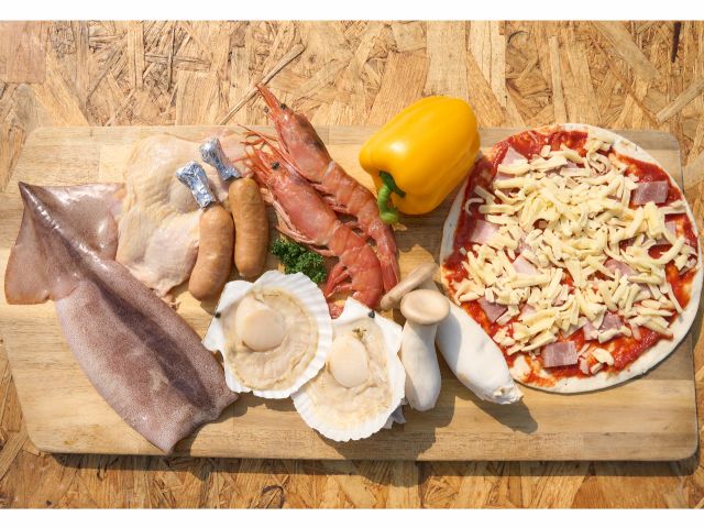 海老・ホタテ・イカ・鶏もも肉・骨付ソーセージ・季節の野菜盛り合わせ・ピザがつきます。