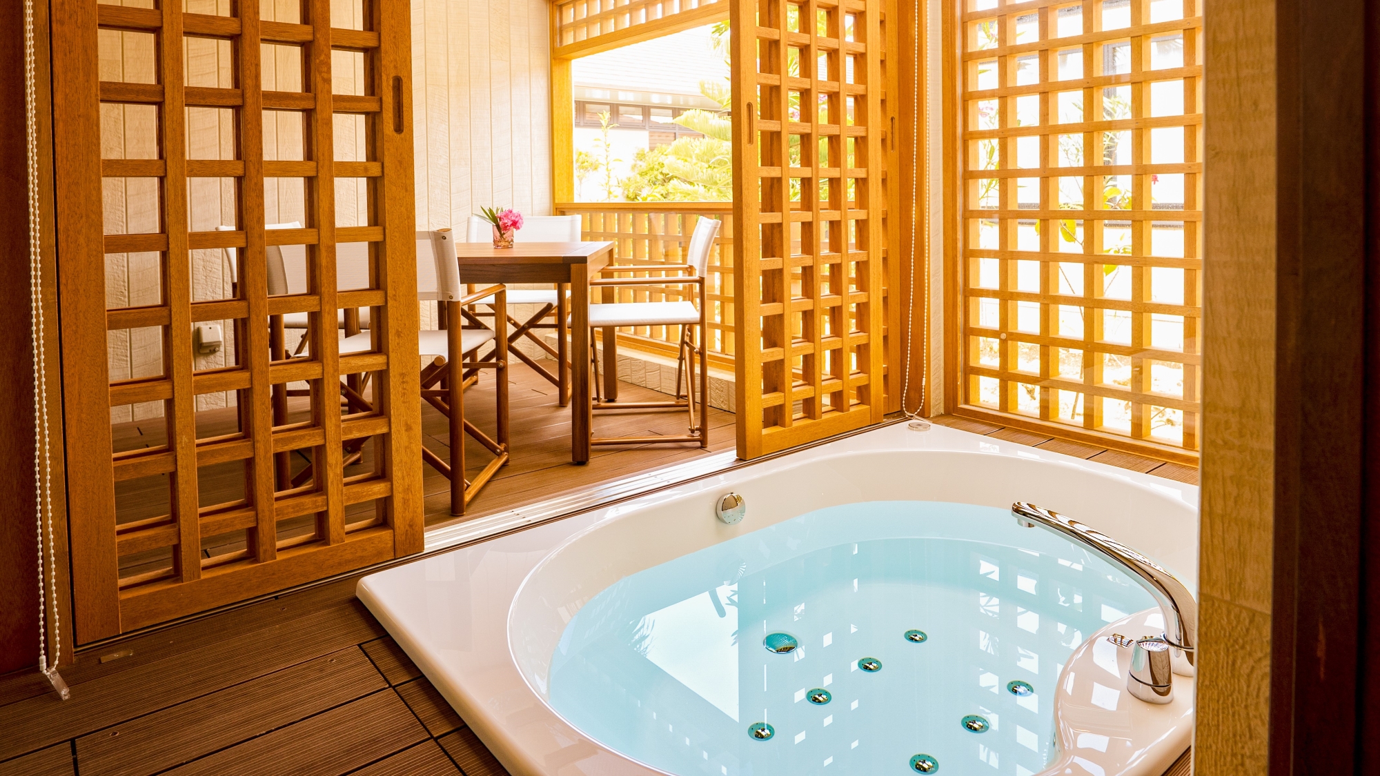 テラスには、バスタイムをゆったりと愉しめるジャグジーバスも完備し、まるで別荘にいるかのような極上の居心地を演出します。